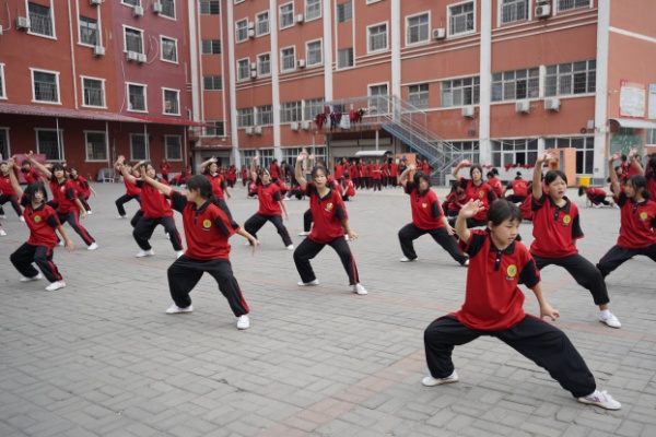 学生在嵩山少林文武学校上学,练习少林功夫的基本功;基本功包括腿功、腰功、肩功和桩功等主要内容。腿功表现的是腿部的柔韧性、灵活性和力量等功夫;腰功表现的是腰部灵活性、协调控制上下肢运动的能力和身法技巧的功夫;肩功表现的'是肩关节柔韧性、活动范围的大小以及力量等方面的功夫;桩功表现的是腿部力量和呼吸内息的功夫。
